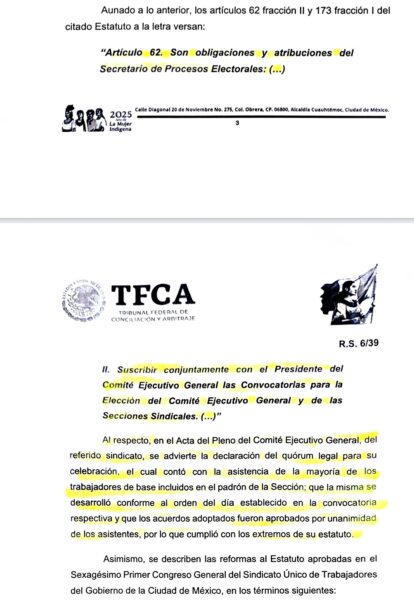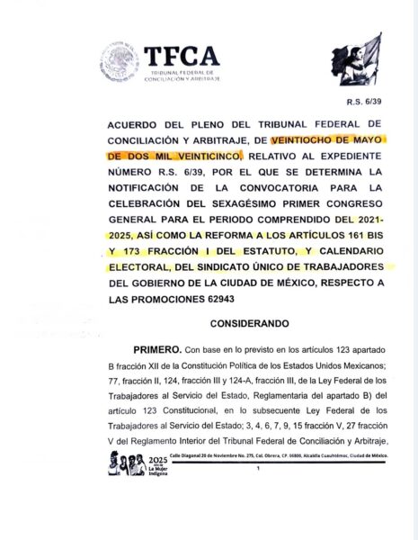 El documento expedido por el Tribunal Federal de Conciliación y Arbitraje (TFCA), el pasado 28 de mayo de este año, refiere que los días primero y seis de marzo del 2023, se dieron las citadas reformas en un Pleno donde hubo el quórum necesario para llevar a cabo el referido Congreso.