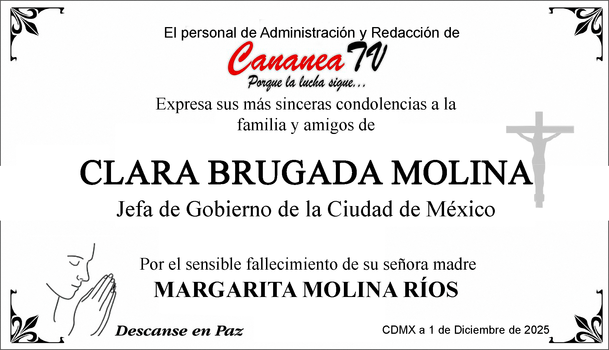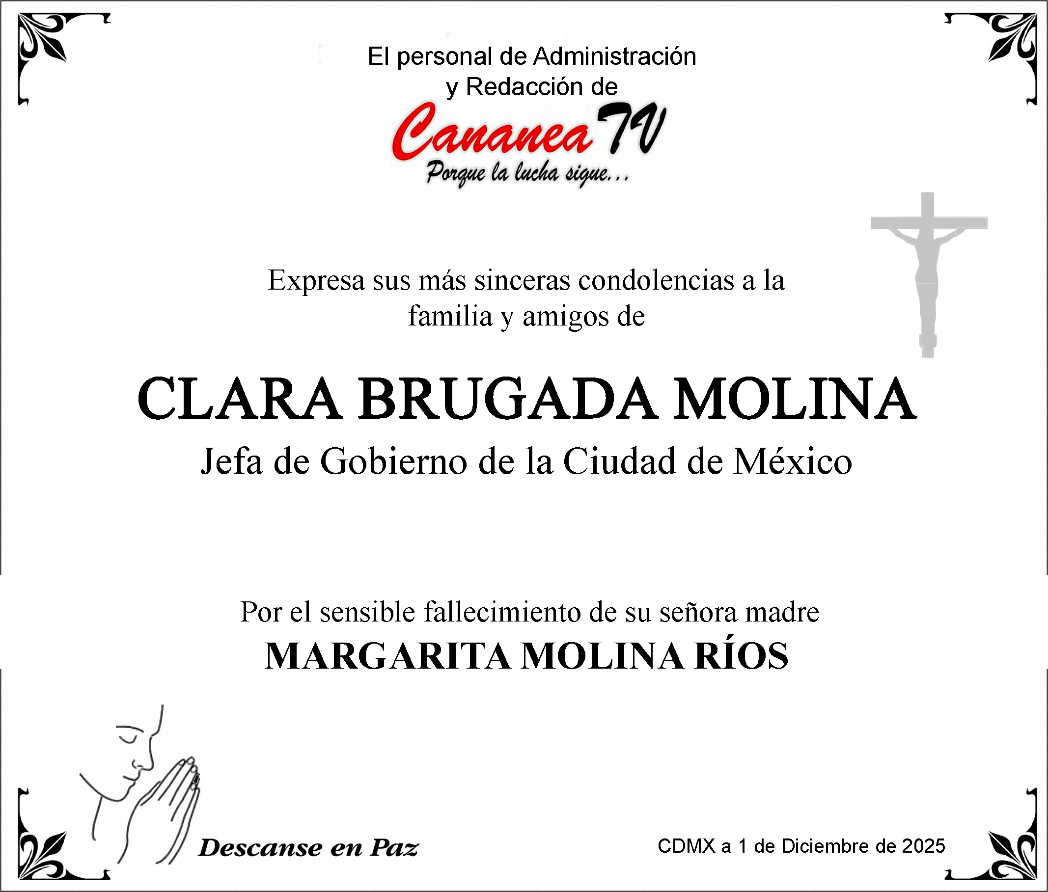 CananeaTV Expresa su más Sentido Pésame a Clara Brugada Molina