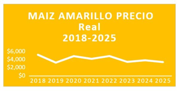 En el caso de los precios reales para maíz blanco, considerando la inflación y los subsidios gubernamentales, se han mantenido en el 2023, 2024, 2025 por debajo del precio del precio del 2022. Y los precios 2018 y 2019 estuvieron en términos reales por debajo del precio 2020. La consecuencia directa de esta política general de precios es que con ello las importaciones se han mantenido en crecimiento acelerado y se han venido tragando la producción interna.