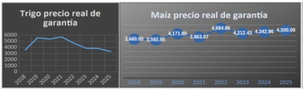 La mayoría de los precios de garantía (que requieren montos presupuestales que el gobierno ha mantenido en caída) tanto para productores de la pequeña agricultura como de mediana agricultura aparecen muy golpeados para el periodo 2018-2025. De este grupo de productos, trigo, maíz blanco, maíz amarillo y el frijol son los que han resultado muy castigados.
