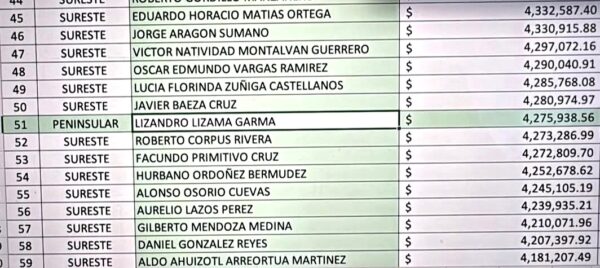 En el lugar 51 aparece el eterno coordinador y líder de la Región Peninsular, con 4 millones 275 mil 938 pesos