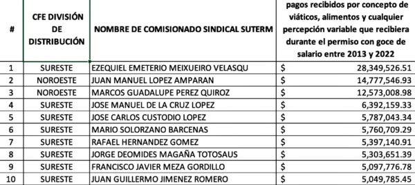 De acuerdo a una solicitud de información entregada por el INAI en el 2022, un buen número de los mil 500 comisionados del Sindicato Único de Trabajadores Electricistas de la República Mexicana (SUTERM), cobraron por viáticos, comidas y otros conceptos no muy claros como “percepciones variables”, montos individuales de hasta 28 millones de pesos; en contraparte a los bajos salarios y mermadas prestaciones que afrontan la gran mayoría de los 70 mil trabajadores de base; corrientes de la disidencia, buscan que la Presidenta, Claudia Sheinbaum, conozca de estas “nóminas doradas”, producto de la corrupción en la CFE