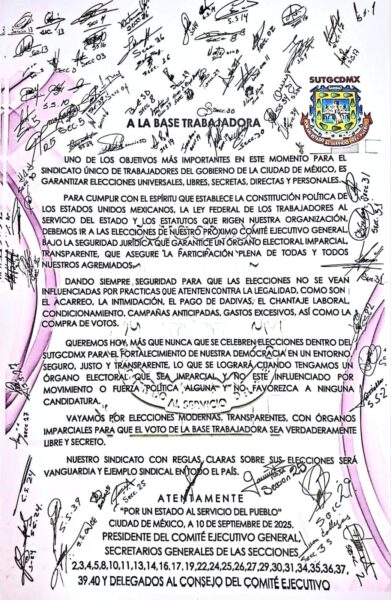 Los Secretarios de 26 secciones del Sindicato Único de Trabajadores del Gobierno de la Ciudad de México (SUTGCDMX), del Grupo Rojo, emitieron el pasado 10 del mes en curso un comunicado dirigido a la base trabajadora que comienza a trascender, donde aceptan la realización de elecciones democráticas a través del voto libre, directo y secreto