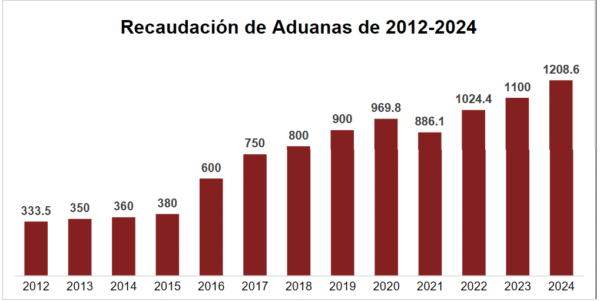 La evolución de la recaudación aduanera refleja los avances en la fiscalización y el fortalecimiento institucional. Entre 2012 y 2024 los ingresos aduaneros pasaron de 333.5 mil millones de pesos a 1.2 billones de pesos, lo que representa un crecimiento de más del 260% en el periodo. Tan sólo entre 2018 y 2024, la recaudación aumentó 24.6%, impulsada por la incorporación de controles tecnológicos, mayores facultades de verificación y una estrategia más estricta contra la evasión y el contrabando.